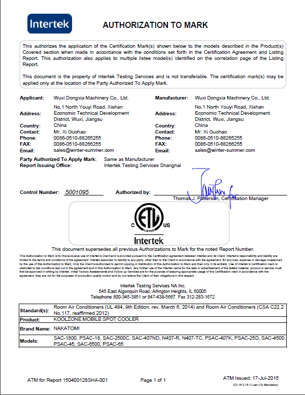 爱游戏(ayx)体育官方网站近日宣布公司移动式工业冷气机获得的质量与安全第三方机构天祥实验室(世界上规模的消费品测试、检验和认证公司之一)颁发的ETL认证。